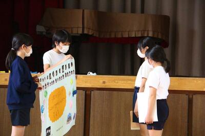 10月3日 小学校児童会の引継ぎ式・後期学級代表の任命式が行われました。後期児童会に今年度の目標が引き継がれ、新体制で「三泉ライジング」の目標達成を目指していきたいと意気込みを語りました。